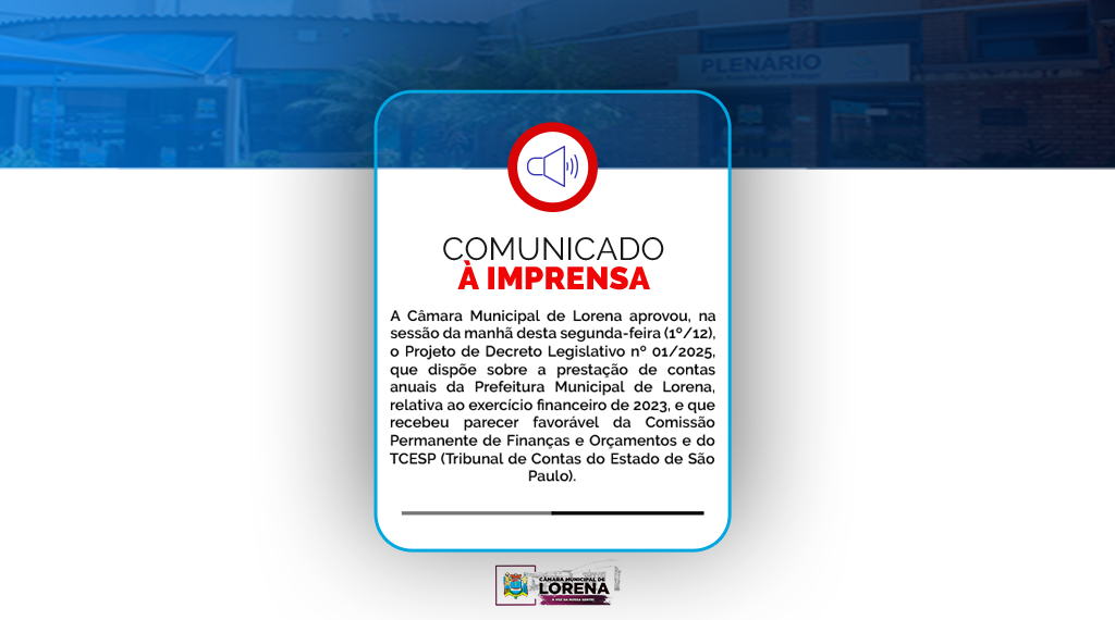 A Câmara Municipal de Lorena aprovou, na sessão da manhã desta segunda-feira (1º/12), o Projeto de Decreto Legislativo nº 01/2025, que dispõe sobre a...