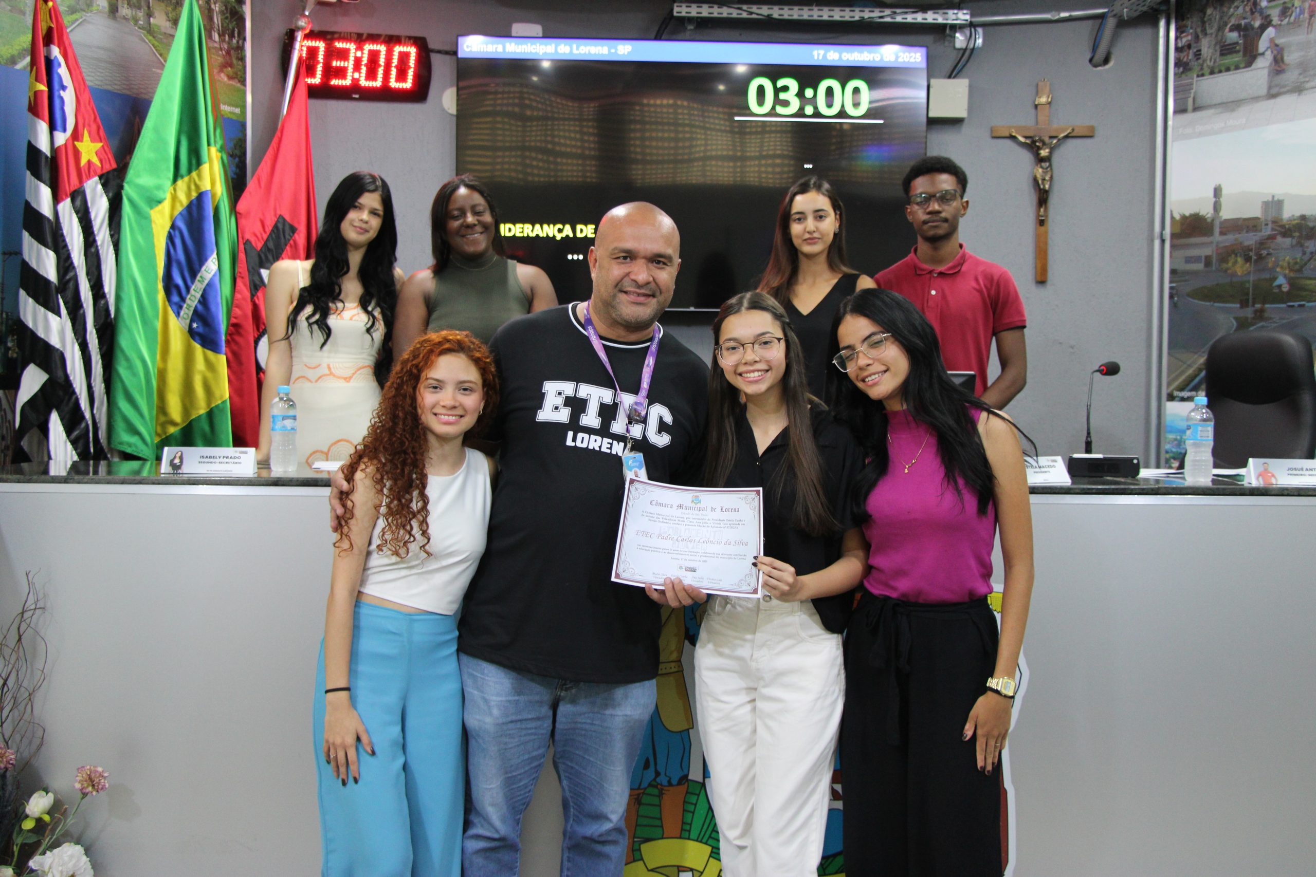 À Escola Técnica Estadual (Etec Padre Carlos Leôncio da Silva), pelos 15 anos de sua fundação, celebrando sua relevante contribuição à educação pública e ao desenvolvimento social e profissional do município. A homenagem foi apresentada pelas vereadoras jovens Maria Clara Moreira do Nascimento, Ana Júlia Vitória Ramos de Amaral e Vitória Laís Tortorello de Oliveira.