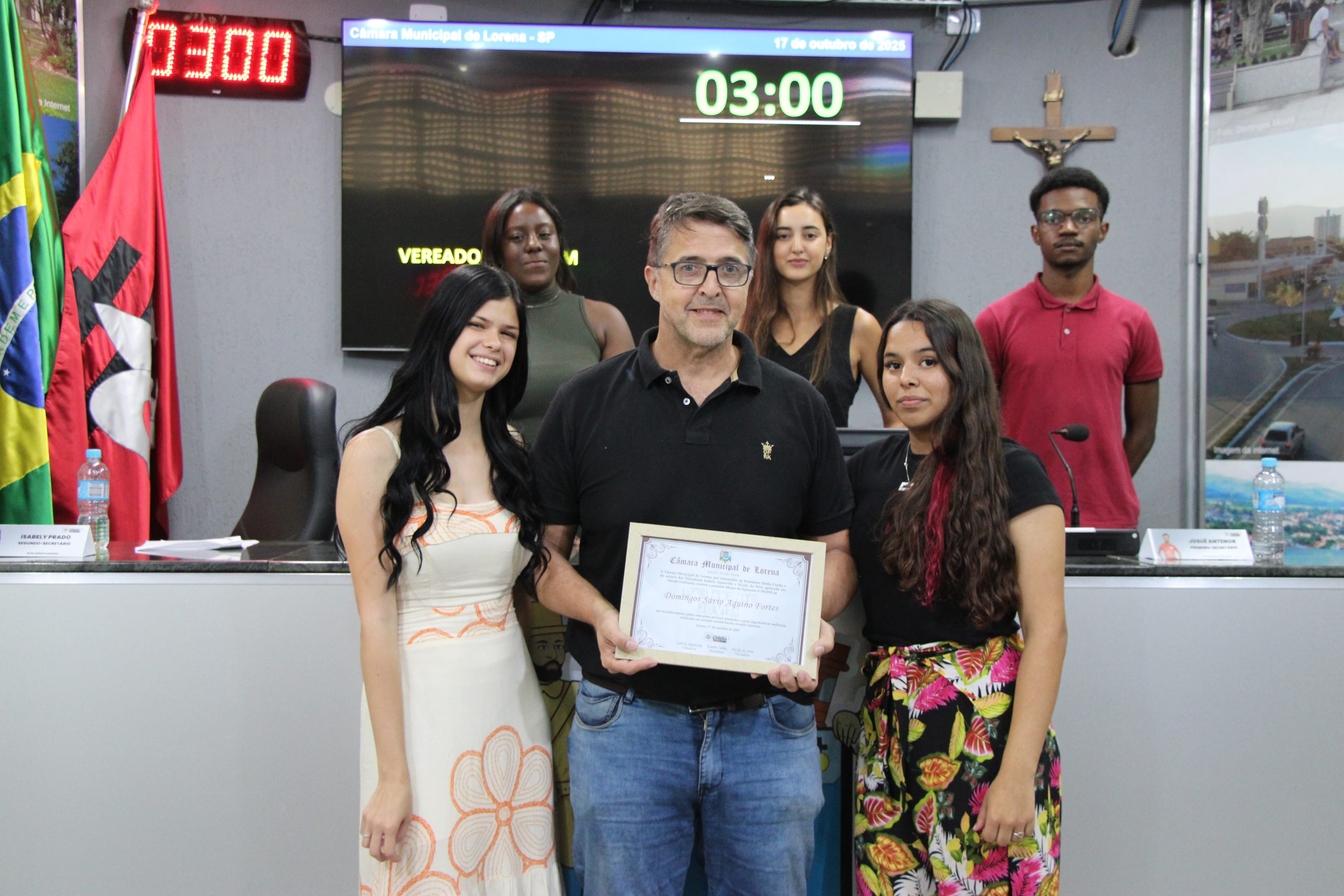 Ao diretor Sávio Fortes, da EE PEI (Programa de Ensino Integral) Arnolfo Azevedo, pelos relevantes serviços prestados e pelas significativas melhorias realizadas na unidade escolar. O reconhecimento foi apresentado pelas vereadoras jovens Isabely Aparecida do Prado e Nicoly Alvarenga.
