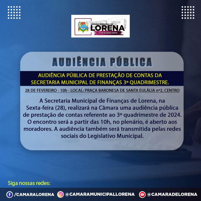 A Secretaria Municipal de Finanças de Lorena, nesta sexta-feira (28) realizará na Câmara, uma audiência pública de prestação de contas referente ao 3º quadrimestre de 2024.