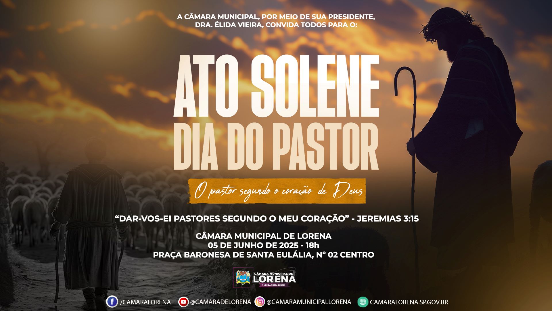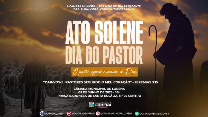 A Câmara de Lorena promoverá, na quinta-feira (5/6), às 18h, um Ato Solene em celebração ao Dia do Pastor, que acontecerá no plenário.