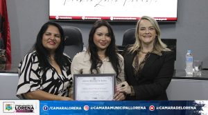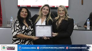 Patrícia Marques Faria de Ávila, homenageada pela presidente Dra. Élida Vieira (PODE). Assistente social e pós-graduada, atua na Secretaria Municipal de Saúde de Lorena e coordena o Bolsa Família. Foi premiada pelo MDS (Ministério da Assistência e Desenvolvimento Social e Combate à Fome), presidiu o Conselho de Assistência Social e tem uma extensa trajetória em defesa de políticas públicas voltadas à proteção social e aos direitos humanos.
