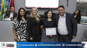 Francine Dias dos Santos Capella, homenageada pela vereadora Dra. Élida Vieira (PODE). Assistente social com mais de 20 anos de atuação e pós-graduada em Gestão de Pessoas. Servidora da Prefeitura de Lorena há 11 anos, já atuou no CREAS (Centro de Referência Especializado de Assistência Social), CAPS (Centro de Atenção Psicossocial) e CER (Centro Especializado em Reabilitação). Foi secretária municipal de Assistência e Desenvolvimento Social em 2023 e hoje coordena o CREAS.